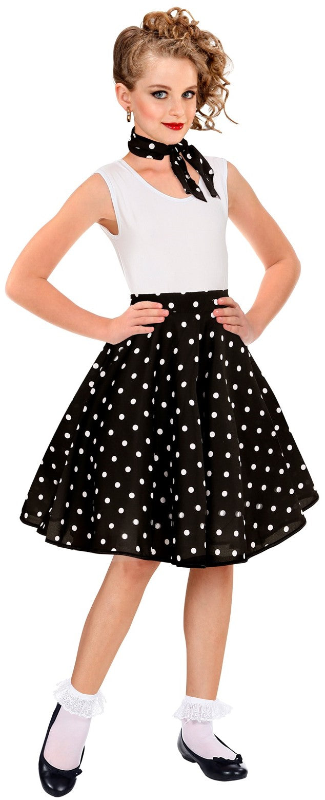 Incluye: Una falda con vuelo negra con lunares blancos y un pañuelo a juego.