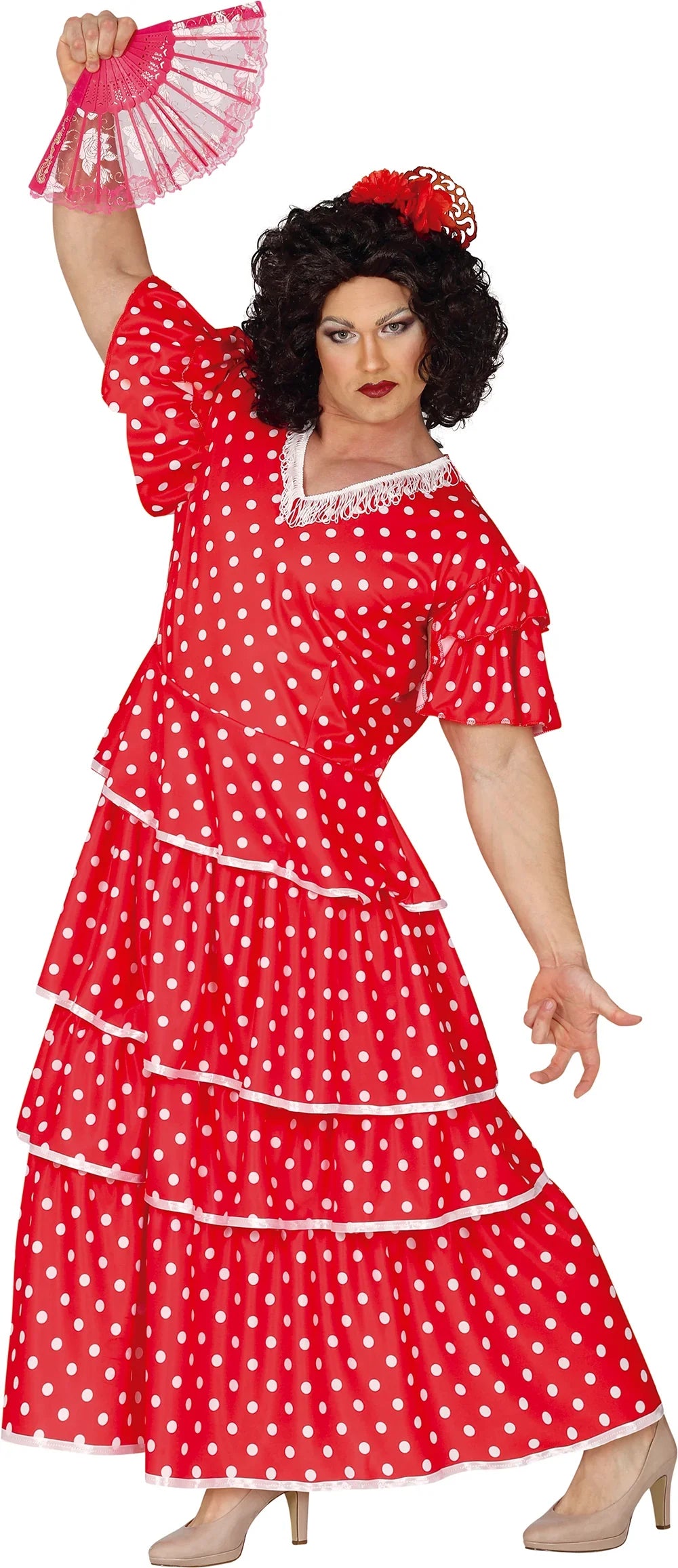 ¿Estás buscando un disfraz de flamenca para tu fiesta? Con el disfraz de sevillana para hombre en color rojo con lunares blancos tendrás el traje más original y divertido para tu fiesta de disfraces o para disfrazar al novio en la despedida de soltero.