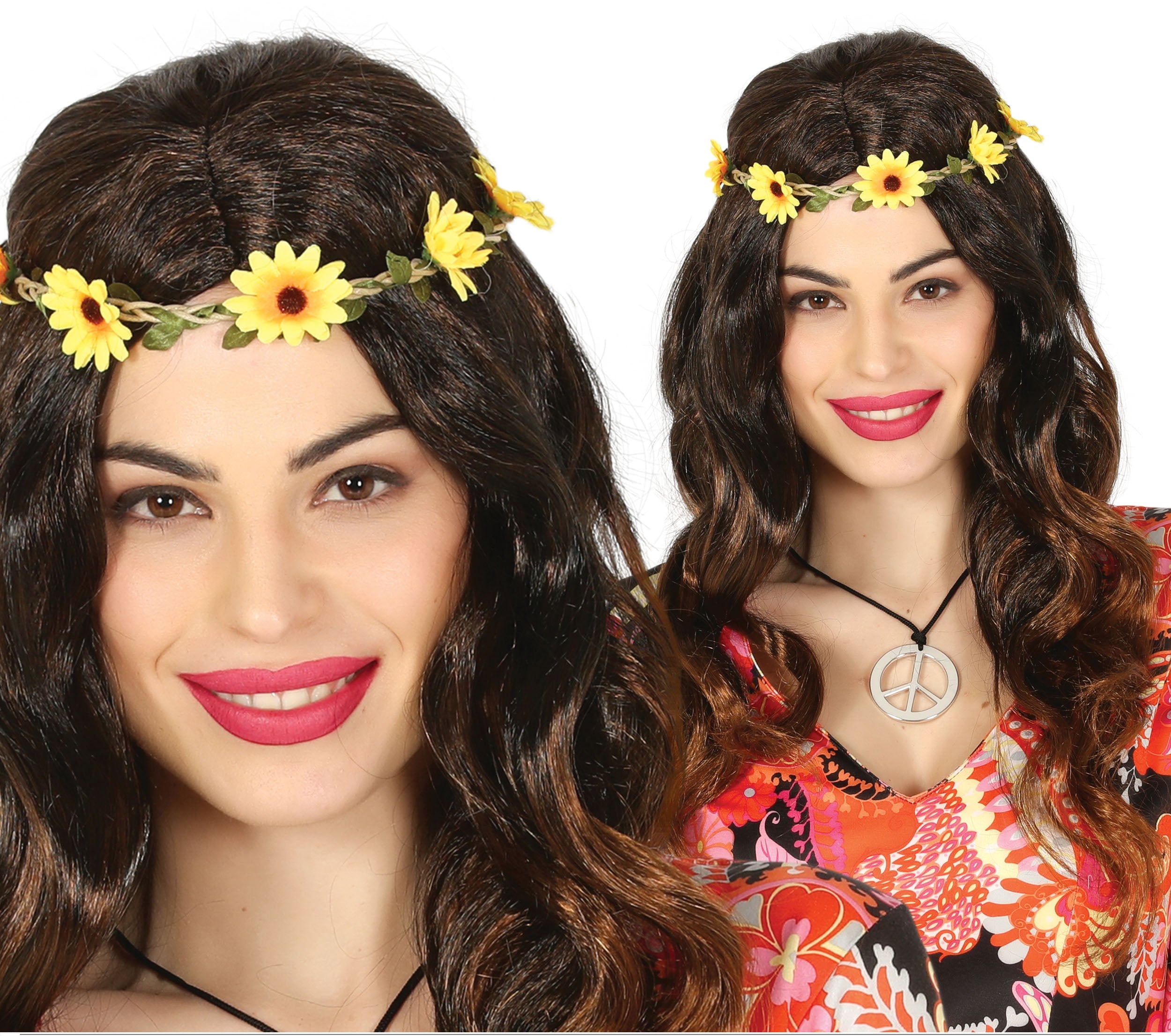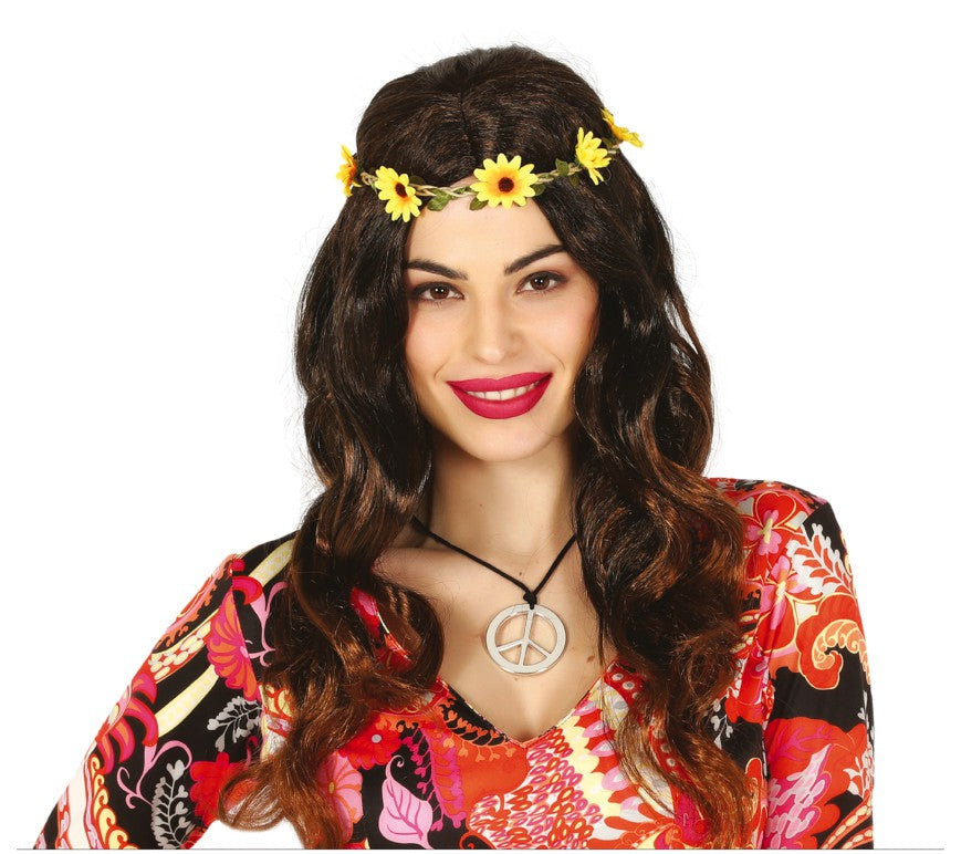 ¿Buscas la peluca de estilo hippie más auténtica? Esta peluca melena morena con diadema de flores te convertirá en la auténtica reina de los hippies de la forma más original.