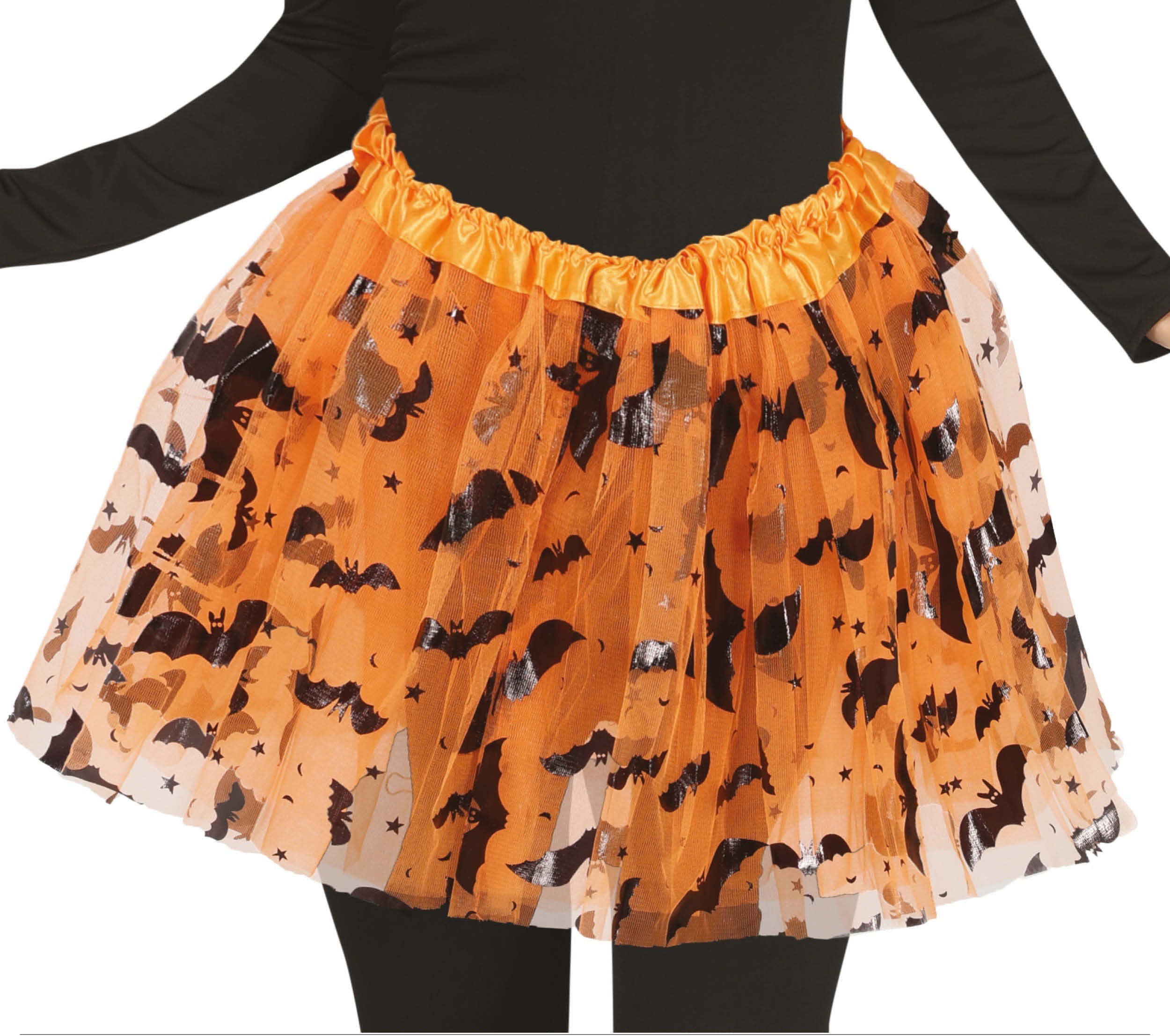 Si quieres crear el disfraz de tu hija para Halloween con accesorios, este tutú naranja decorado Halloween para niña le encantará. Una preciosa falda de tul de 40cm de larga con decorado que le dará ese toque siniestro para triunfar en Halloween.