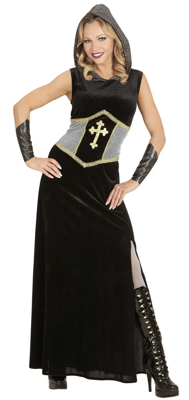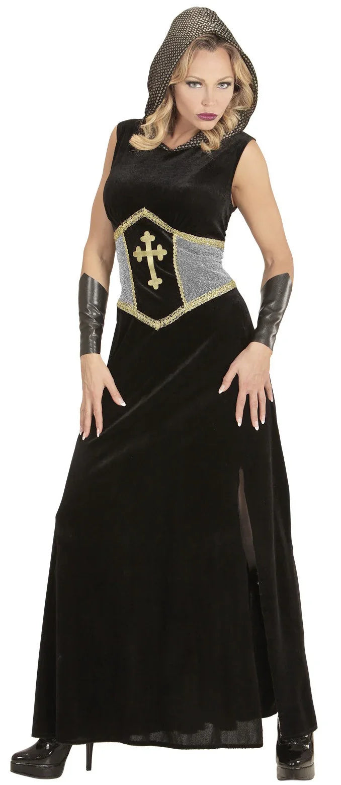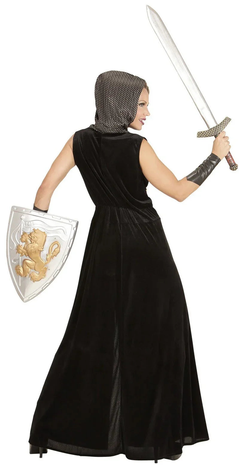 Questo costume da guerriera medievale include, vestito lungo in velluto nero, con pezzi in vita in lame argento e decorazione in passamaneria dorata per renderlo molto più appariscente. Cappuccio unito al vestito in tessuto a maglia stampato, bracciali in ecopelle.