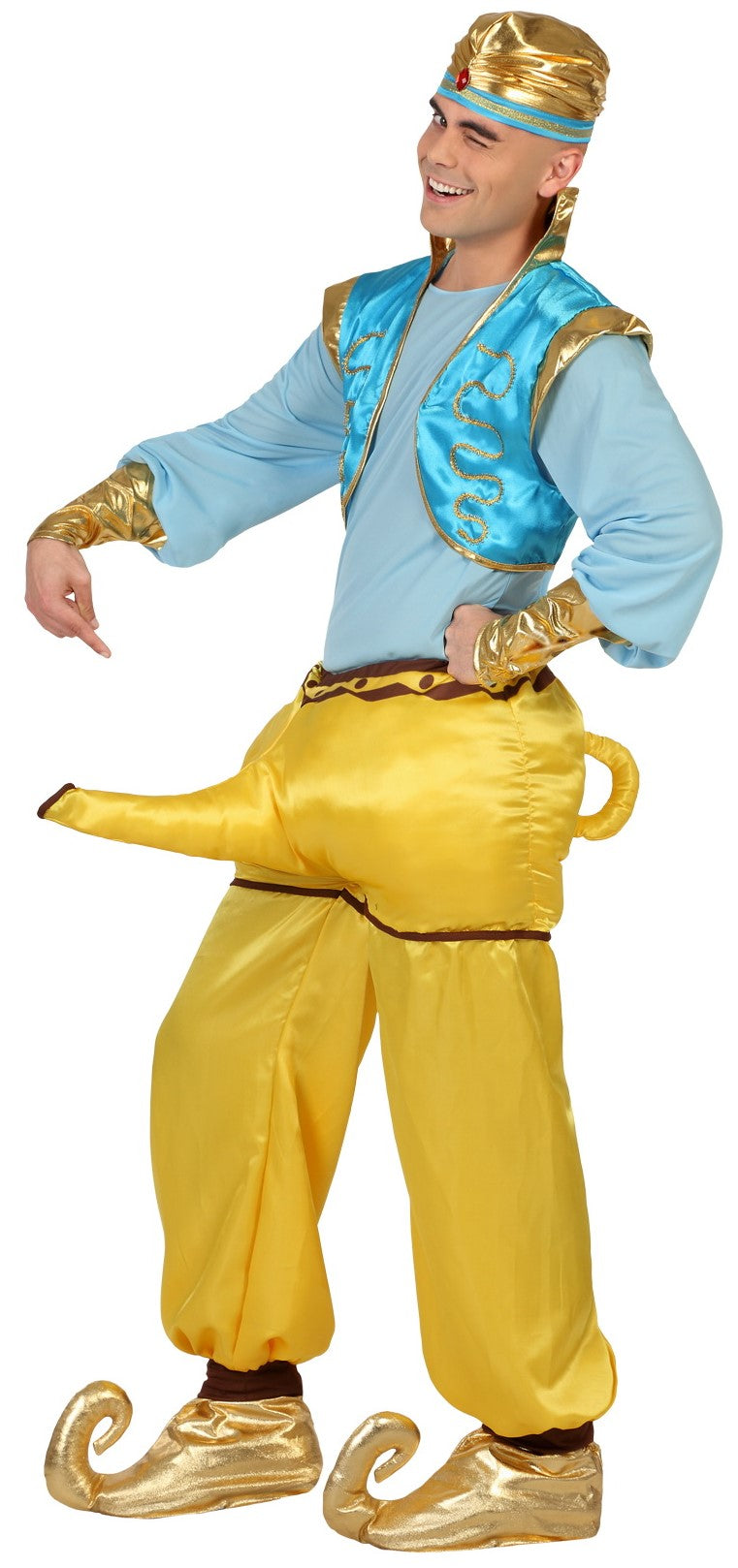 Include: Pantalone in raso giallo con lampada magica, camicia in punto con polsini in lame oro, gilet in raso e lame decorato con passamaneria oro e cappello in lame oro. Questo è un costume super originale e con esso non passerai inosservato. Speciale per addii al celibato. Nella nostra sezione accessori potrai trovare le copriscarpe in lame oro.