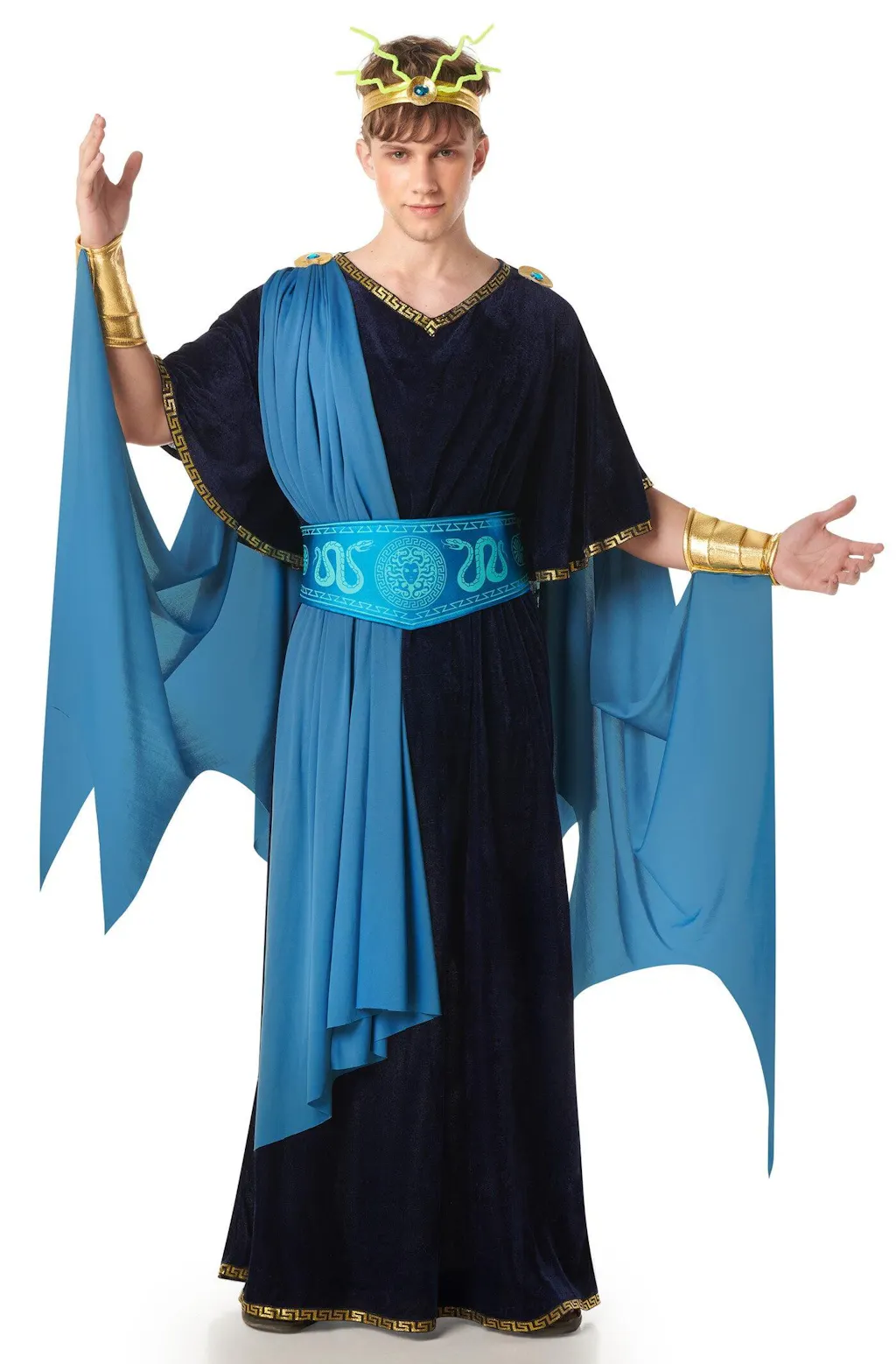 Stai cercando un costume da principe greco per la tua festa? Con il costume da principe greco Medusa per uomo avrai l'abito perfetto per travestirti da elegante principe dell'Antica Grecia con tunica nera e toga blu e ti distinguerai alla festa in maschera.