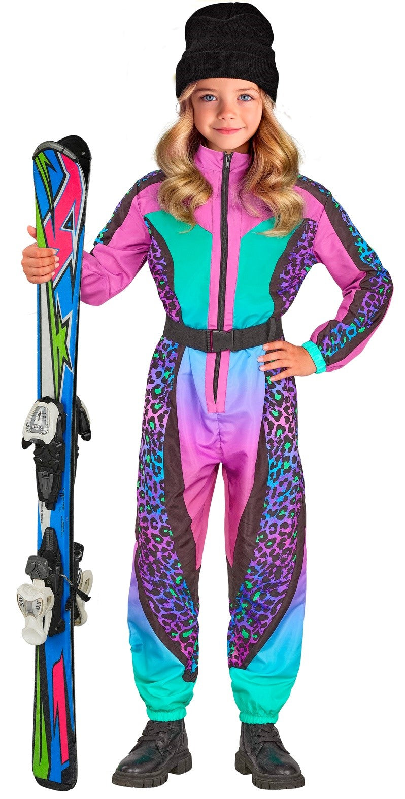 Stai cercando un costume da sciatrice anni '80 per tua figlia? Con il costume da sciatrice o snowboarder per bambini con stampa animalier leopardata multicolore avrai il completo da sci più alla moda per travestire la tua bambina come una vera appassionata di questi sport sulla neve.