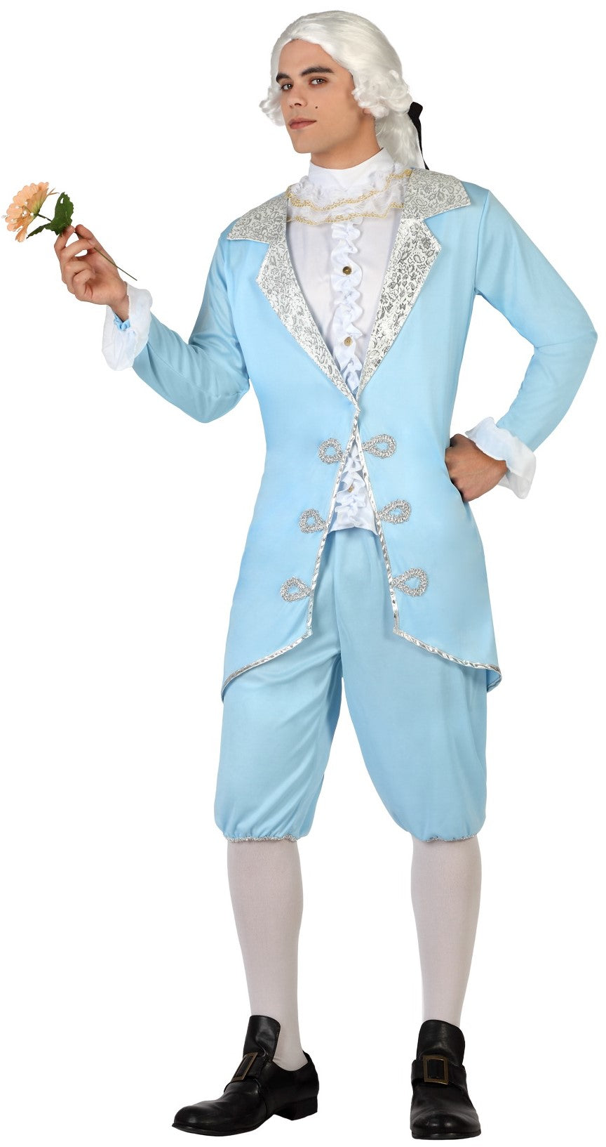 Questo costume è composto da una giacca levita in maglia blu con bordatura argentata e lame sulle bavette. Camicia con volant e colletto in pizzo. Pantaloni in maglia con bordatura argentata.
