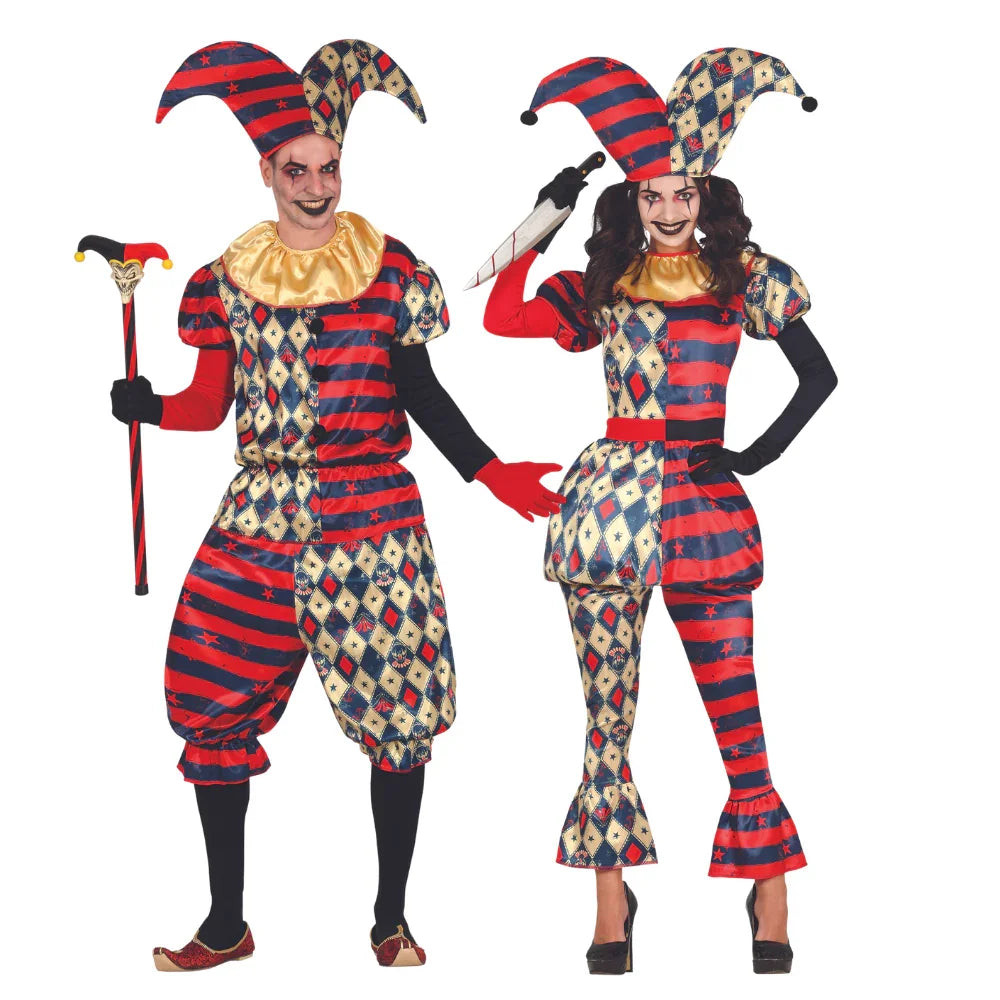 Stai cercando costumi da arlecchino assassino per coppia? Con i costumi da arlecchino diabolico per uomo e donna avrete i vestiti perfetti per travestirvi da buffoni psicopatici e trionfare alla festa di Halloween.