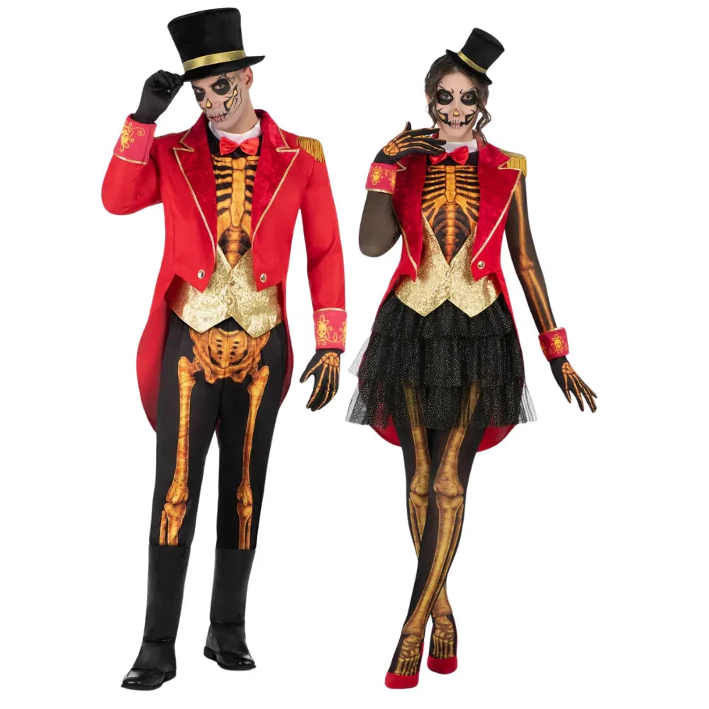 Stai cercando costumi di Halloween per coppie? Con i costumi da domatore e domatrice scheletro uomo e donna avrete i vestiti perfetti per travestirvi da terrificanti direttori di un circo dell'orrore e trionfarete alla festa di Halloween.