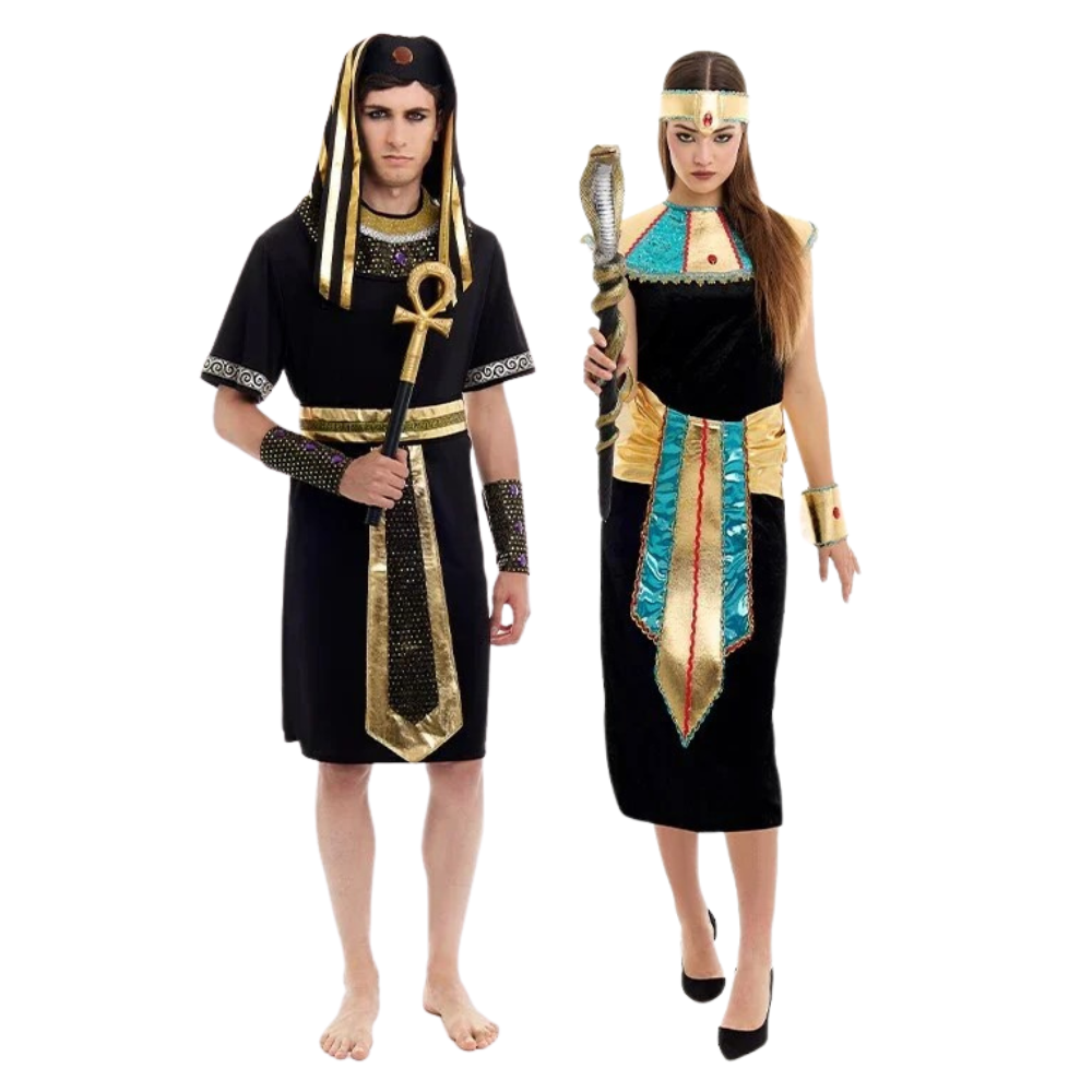 Stai cercando costumi da faraone per coppia? Con i costumi da egiziano e egiziana per uomo e donna in colore nero avrete i vestiti perfetti per travestirvi come i governanti del Nilo nell'Antico Egitto e trionfarete alla festa in maschera.
