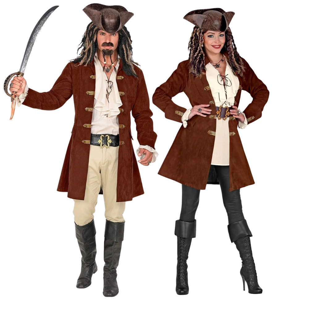 Stai cercando giacche da pirata per andare in coppia? Con le giacche da pirata per uomo e donna in stile pelle scamosciata di colore marrone avrete gli accessori perfetti per travestirvi da autentici capitani pirata e trionfare alla festa in maschera.