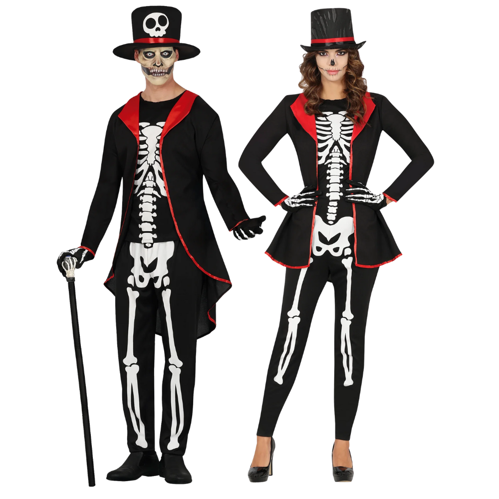 Stai cercando costumi da scheletro per coppia? Con i costumi da scheletro elegante per uomo e donna avrete i vestiti perfetti per travestirvi da scheletri eleganti con frac e trionfarete alla festa di Halloween.