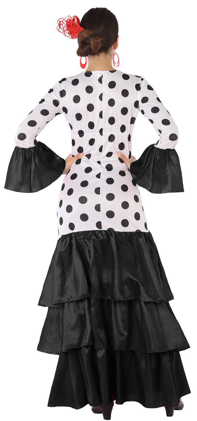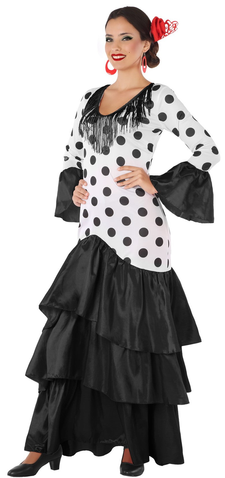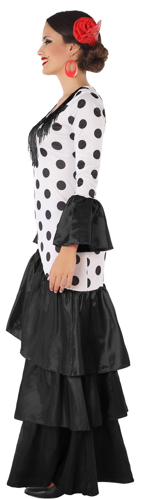 Stai cercando il costume da sevillana più autentico? Questo vestito bianco con pois neri e volant neri per adulti ti darà quel tocco di eleganza e originalità perfetto per goderti al massimo la Feria de Abril.
